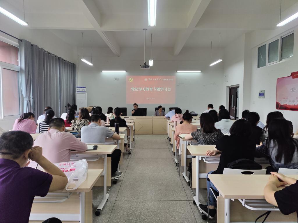 5月9日,我院在博学楼3栋424会议室召开党纪学习教育专题学习会暨教职工会议,院长兼党总支副书记徐承英主持会议,全体教职工参加会议。