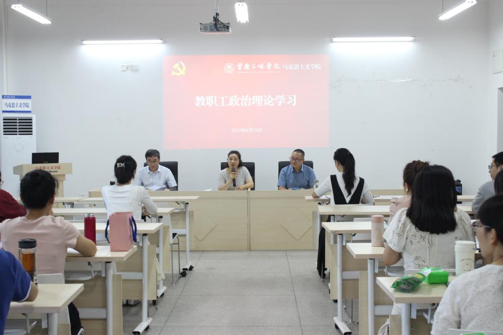 在教职工会议上,党总支副书记、副院长任鹏对教学、科研等工作进行了布置。学院院长兼党总支副书记徐承英对研究生及本科生教学、思政课教师集体培训等工作进行了强调,要求全体教师要以习近平总书记对学校思政课建设的重要指示为标尺,全面落实立德树人根本任务,努力提高业务素质,深入研究、潜心教学,推动思想政治理论课教学水平向更高目标迈进。