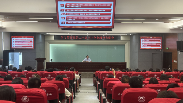 9月27日,学校党委书记李廷勇在科技楼二楼连廊会议室宣讲党的二十届三中全会精神。文学院、太阳集团tcy8722师生近200人到会聆听宣讲。