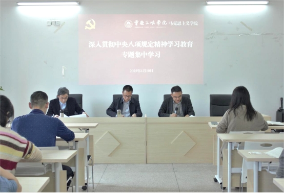 4月10日下午,我院在博学楼3栋424会议室召开政治理论学习暨深入贯彻中央八项规定精神学习教育专题学习会。会议由学院党总支书记秦勤主持,全体教职工参会。