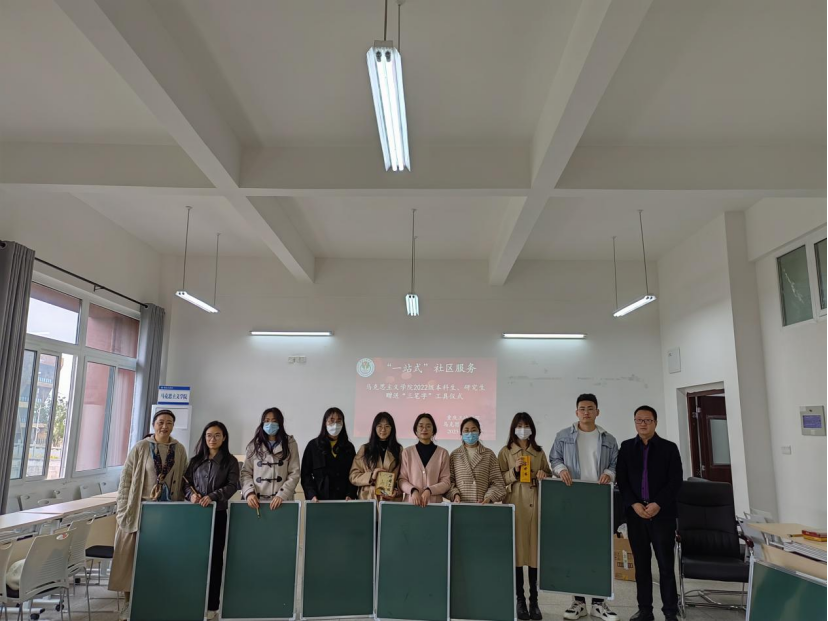 赠送仪式上,徐承英、秦勤代表学院向2022级本科生、研究生赠送毛笔、粉笔、砚台、墨水等“三笔字”工具,并为每个学生寝室配备了小黑板、粉笔擦等物品。