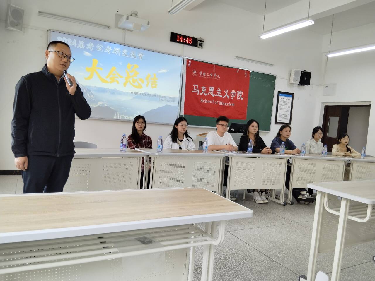 在主题分享环节,2024届学长学姐们结合自身学习、考研、求职的经历和经验,向在场的同学们分享了各自的心路历程和成功的秘诀。他们表示,无论是专业学习,还是考研考公或者其他求职,认真准备是非常重要的环节,需要有扎实的基础知识和良好的心态,科学的复习方法和合理的时间安排也至关重要。在互动交流环节,学弟学妹们就怎样选择适合自己的复习资料、如何应对考试压力、如何丰富大学生活等具体问题向学长学姐请教,学长学姐们也都结合个人情况耐心细致地进行了回答,并给出了一些实用的建议。