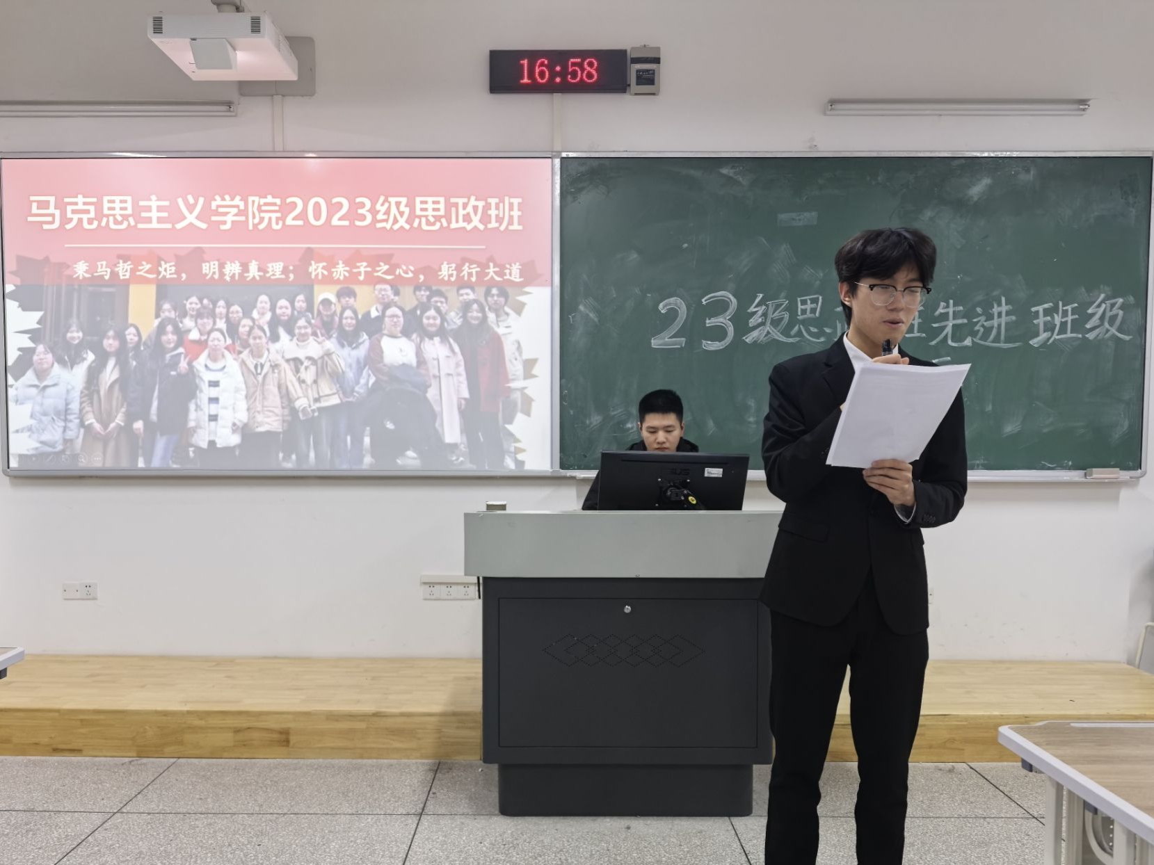 2023级思想政治教育(师范)班曾法同学作为汇报人对班级学风建设等相关情况进行了汇报,汇报从“思想领航 青春向党”“勤学笃行 学风蔚然”“五育并举 全面发展”以及“知行合一 责任担当”四个方面将班集体的先进事迹进行了分享,分享结束后,现场响起了热烈的掌声。