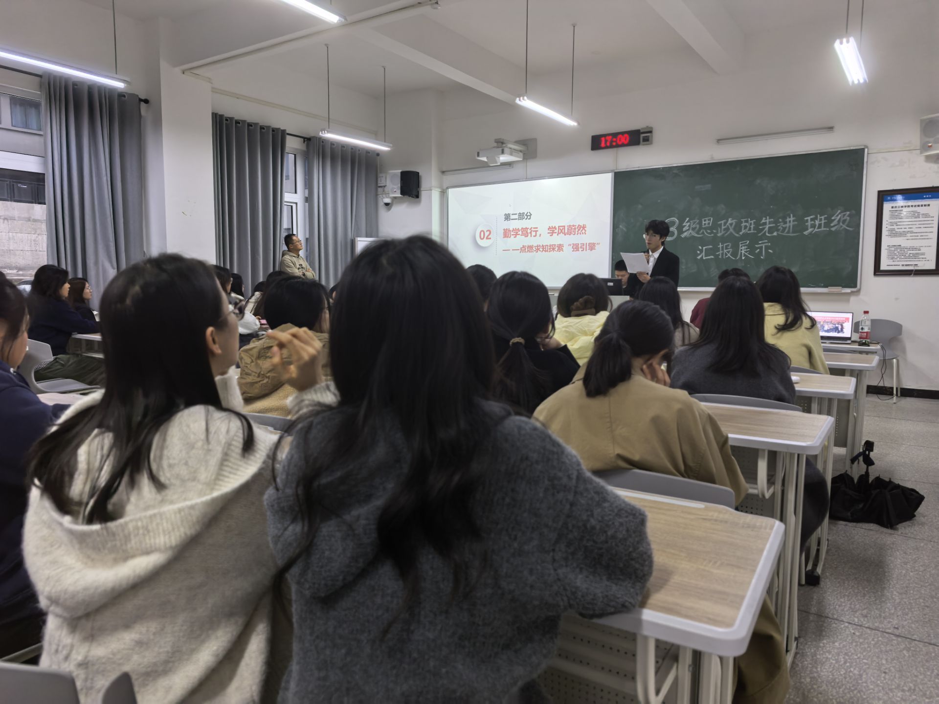 11月16日下午16:30,学院在博学楼1-106教室举办2025年优良学风班和先进班集体事迹分享汇报,全院本科生参与。
